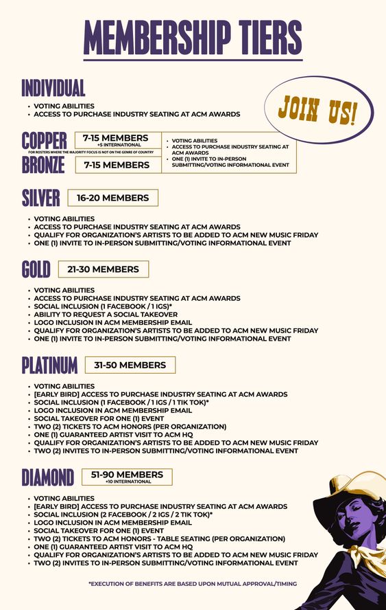 - Must be an industry business organization who works in the country music space BUT it is not their core focus of business. Organizations who fall under this tier are limited to a max of 20 corporate members (15 + 5 International)